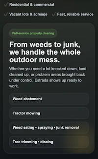Estrada Weed Abatement provides practical, heavy-duty outdoor cleanup services for residential, commercial, and vacant properties. From thick weeds and tractor mowing to junk removal, tree trimming, and discing, we help turn overgrown land into clean, manageable ground again.